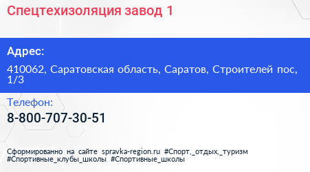 Спецтехизоляция, завод №1 по адресу 410062, Саратовская область, Саратов, Строителей пос, 1/3 в дальнейшем Организация, размещена в следующих категориях:
