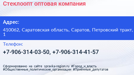 Стеклоопт, оптовая компания по адресу 410062, Саратовская область, Саратов, Петровский тракт, 1 в дальнейшем Организация, размещена в следующих категориях: