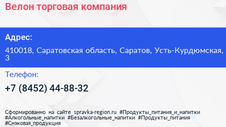 Велон, торговая компания по адресу 410018, Саратовская область, Саратов, Усть-Курдюмская, 3 в дальнейшем Организация, размещена в следующих категориях: