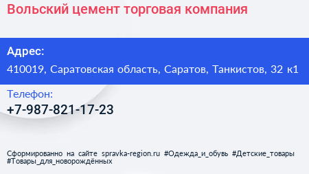 Вольский цемент, торговая компания по адресу 410019, Саратовская область, Саратов, Танкистов, 32 к1 в дальнейшем Организация, размещена в следующих категориях: