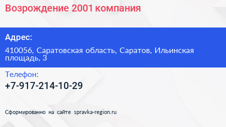 Возрождение-2001, компания по адресу 410056, Саратовская область, Саратов, Ильинская площадь, 3 в дальнейшем Организация, размещена в следующих категориях: