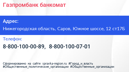 Газпромбанк, банкомат по адресу Нижегородская область, Саров, Южное шоссе, 12 ст17Б в дальнейшем Организация, размещена в следующих категориях: