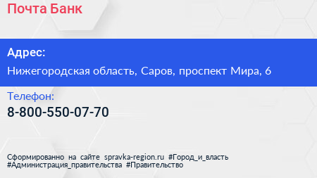Почта Банк по адресу Нижегородская область, Саров, проспект Мира, 6 в дальнейшем Организация, размещена в следующих категориях:
