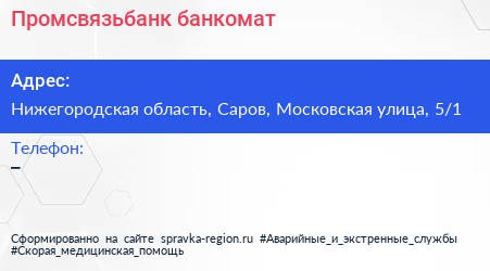 Промсвязьбанк, банкомат по адресу Нижегородская область, Саров, Московская улица, 5/1 в дальнейшем Организация, размещена в следующих категориях: