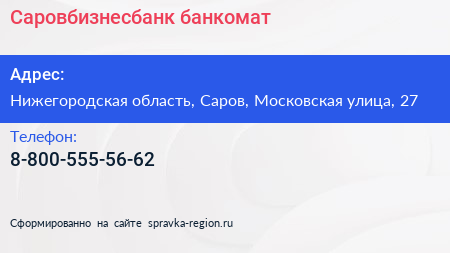 Саровбизнесбанк, банкомат по адресу Нижегородская область, Саров, Московская улица, 27 в дальнейшем Организация, размещена в следующих категориях: