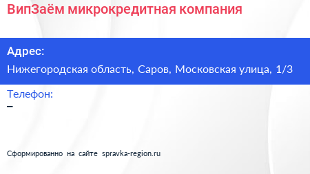 ВипЗаём, микрокредитная компания по адресу Нижегородская область, Саров, Московская улица, 1/3 в дальнейшем Организация, размещена в следующих категориях:
