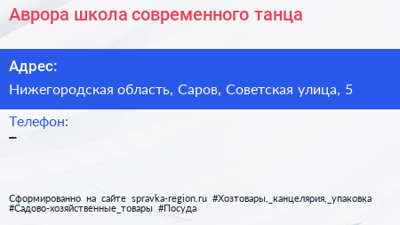 Аврора, школа современного танца по адресу Нижегородская область, Саров, Советская улица, 5 в дальнейшем Организация, размещена в следующих категориях: