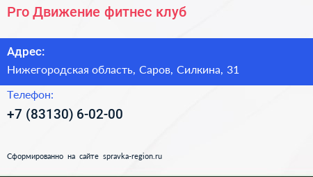 Рго-Движение, фитнес-клуб по адресу Нижегородская область, Саров, Силкина, 31 в дальнейшем Организация, размещена в следующих категориях: