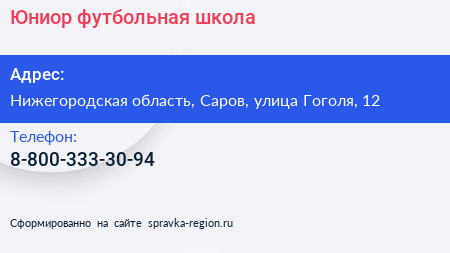 Юниор, футбольная школа по адресу Нижегородская область, Саров, улица Гоголя, 12 в дальнейшем Организация, размещена в следующих категориях: