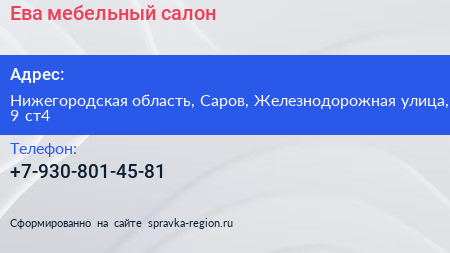 Ева, мебельный салон по адресу Нижегородская область, Саров, Железнодорожная улица, 9 ст4 в дальнейшем Организация, размещена в следующих категориях: