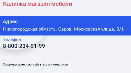 Калинка, магазин мебели по адресу Нижегородская область, Саров, Московская улица, 3/1 в дальнейшем Организация, размещена в следующих категориях: