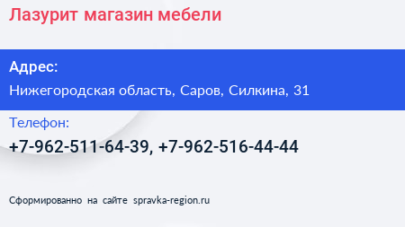 Лазурит, магазин мебели по адресу Нижегородская область, Саров, Силкина, 31 в дальнейшем Организация, размещена в следующих категориях: