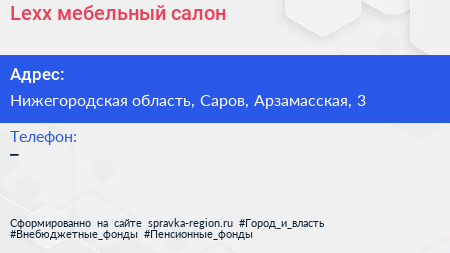 Lexx, мебельный салон по адресу Нижегородская область, Саров, Арзамасская, 3 в дальнейшем Организация, размещена в следующих категориях: