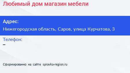 Любимый дом, магазин мебели по адресу Нижегородская область, Саров, улица Курчатова, 3 в дальнейшем Организация, размещена в следующих категориях:
