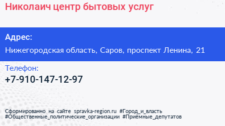 Николаич, центр бытовых услуг по адресу Нижегородская область, Саров, проспект Ленина, 21 в дальнейшем Организация, размещена в следующих категориях: