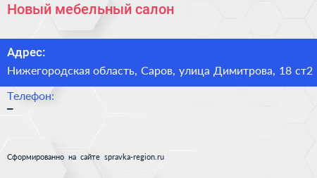 Новый, мебельный салон по адресу Нижегородская область, Саров, улица Димитрова, 18 ст2 в дальнейшем Организация, размещена в следующих категориях: