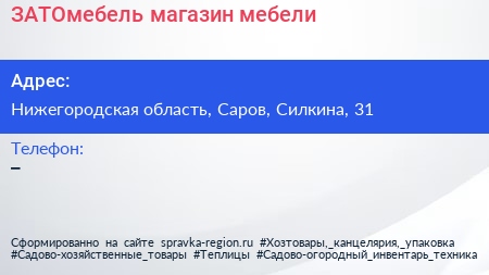 ЗАТОмебель, магазин мебели по адресу Нижегородская область, Саров, Силкина, 31 в дальнейшем Организация, размещена в следующих категориях: