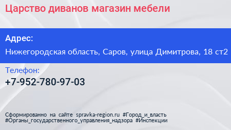 Царство диванов, магазин мебели по адресу Нижегородская область, Саров, улица Димитрова, 18 ст2 в дальнейшем Организация, размещена в следующих категориях: