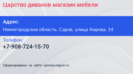 Царство диванов, магазин мебели по адресу Нижегородская область, Саров, улица Кирова, 14 в дальнейшем Организация, размещена в следующих категориях: