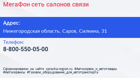 МегаФон, сеть салонов связи по адресу Нижегородская область, Саров, Силкина, 31 в дальнейшем Организация, размещена в следующих категориях: