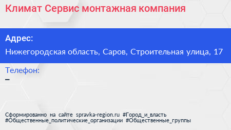 Климат Сервис, монтажная компания по адресу Нижегородская область, Саров, Строительная улица, 17 в дальнейшем Организация, размещена в следующих категориях: