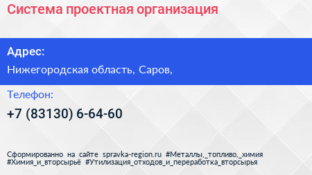 Система, проектная организация по адресу Нижегородская область, Саров, в дальнейшем Организация, размещена в следующих категориях: