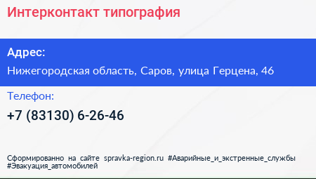 Интерконтакт, типография по адресу Нижегородская область, Саров, улица Герцена, 46 в дальнейшем Организация, размещена в следующих категориях: