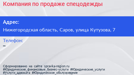 Компания по продаже спецодежды по адресу Нижегородская область, Саров, улица Кутузова, 7 в дальнейшем Организация, размещена в следующих категориях:
