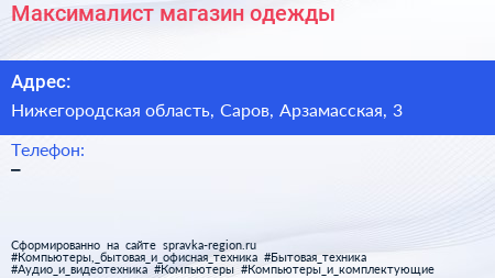 Максималист, магазин одежды по адресу Нижегородская область, Саров, Арзамасская, 3 в дальнейшем Организация, размещена в следующих категориях: