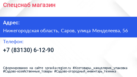 Спецснаб, магазин по адресу Нижегородская область, Саров, улица Менделеева, 56 в дальнейшем Организация, размещена в следующих категориях: