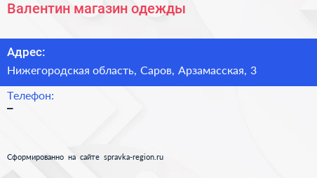 Валентин, магазин одежды по адресу Нижегородская область, Саров, Арзамасская, 3 в дальнейшем Организация, размещена в следующих категориях: