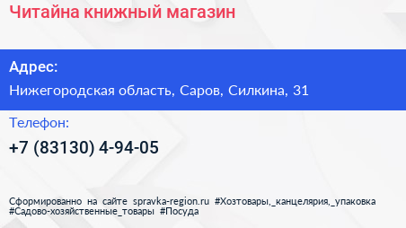 Читайна, книжный магазин по адресу Нижегородская область, Саров, Силкина, 31 в дальнейшем Организация, размещена в следующих категориях:
