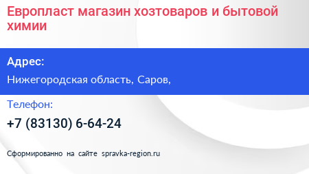 Европласт, магазин хозтоваров и бытовой химии по адресу Нижегородская область, Саров, в дальнейшем Организация, размещена в следующих категориях: