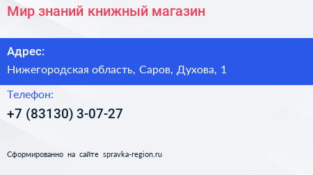 Мир знаний, книжный магазин по адресу Нижегородская область, Саров, Духова, 1 в дальнейшем Организация, размещена в следующих категориях:
