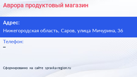 Аврора, продуктовый магазин по адресу Нижегородская область, Саров, улица Мичурина, 36 в дальнейшем Организация, размещена в следующих категориях: