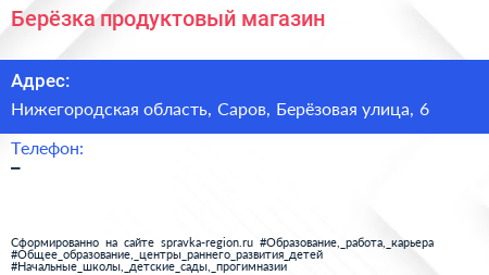 Берёзка, продуктовый магазин по адресу Нижегородская область, Саров, Берёзовая улица, 6 в дальнейшем Организация, размещена в следующих категориях: