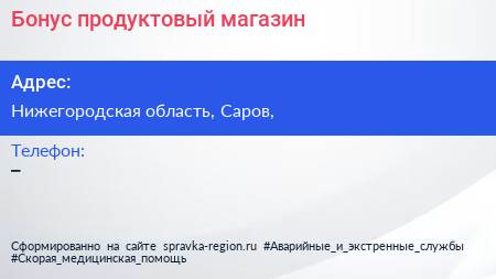 Бонус, продуктовый магазин по адресу Нижегородская область, Саров, в дальнейшем Организация, размещена в следующих категориях: