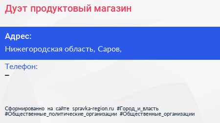 Дуэт, продуктовый магазин по адресу Нижегородская область, Саров, в дальнейшем Организация, размещена в следующих категориях: