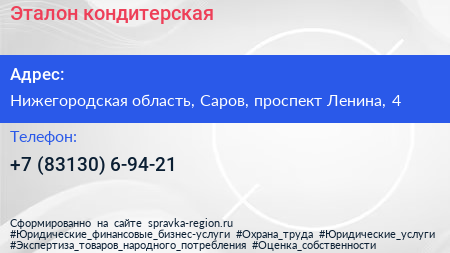Эталон, кондитерская по адресу Нижегородская область, Саров, проспект Ленина, 4 в дальнейшем Организация, размещена в следующих категориях: