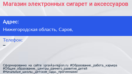 Магазин электронных сигарет и аксессуаров по адресу Нижегородская область, Саров, в дальнейшем Организация, размещена в следующих категориях: