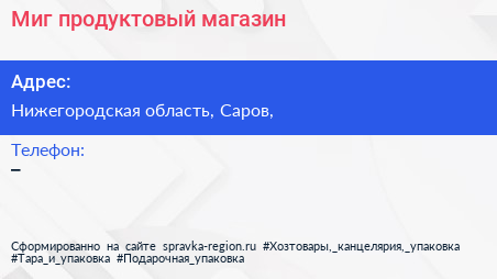 Миг, продуктовый магазин по адресу Нижегородская область, Саров, в дальнейшем Организация, размещена в следующих категориях: