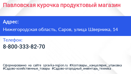 Павловская курочка, продуктовый магазин по адресу Нижегородская область, Саров, улица Шверника, 14 в дальнейшем Организация, размещена в следующих категориях: