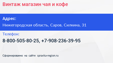 Винтаж, магазин чая и кофе по адресу Нижегородская область, Саров, Силкина, 31 в дальнейшем Организация, размещена в следующих категориях: