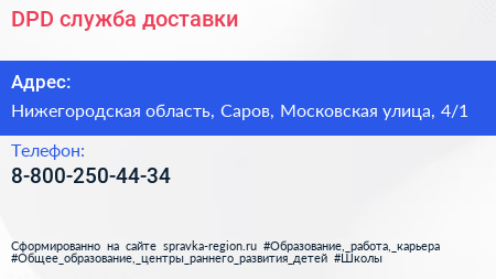 DPD, служба доставки по адресу Нижегородская область, Саров, Московская улица, 4/1 в дальнейшем Организация, размещена в следующих категориях: