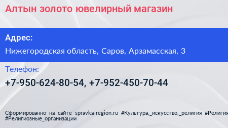 Алтын золото, ювелирный магазин по адресу Нижегородская область, Саров, Арзамасская, 3 в дальнейшем Организация, размещена в следующих категориях: