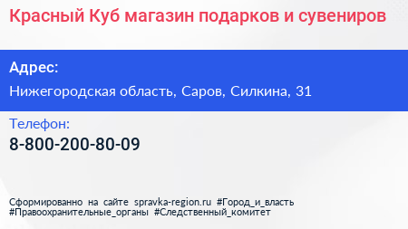 Красный Куб, магазин подарков и сувениров по адресу Нижегородская область, Саров, Силкина, 31 в дальнейшем Организация, размещена в следующих категориях: