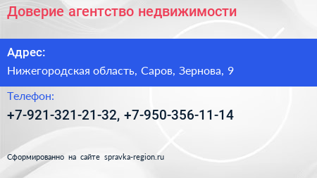 Доверие, агентство недвижимости по адресу Нижегородская область, Саров, Зернова, 9 в дальнейшем Организация, размещена в следующих категориях:
