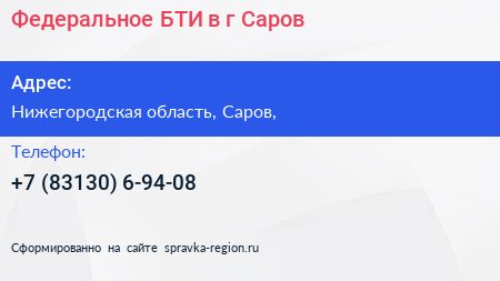 Федеральное БТИ в г. Саров по адресу Нижегородская область, Саров, в дальнейшем Организация, размещена в следующих категориях: