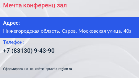 Мечта, конференц-зал по адресу Нижегородская область, Саров, Московская улица, 40а в дальнейшем Организация, размещена в следующих категориях: