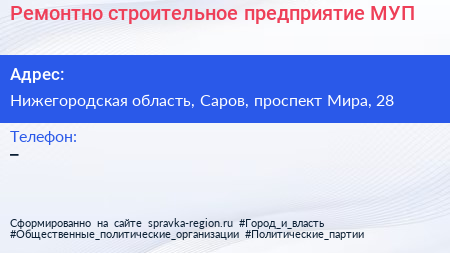 Ремонтно-строительное предприятие, МУП по адресу Нижегородская область, Саров, проспект Мира, 28 в дальнейшем Организация, размещена в следующих категориях: